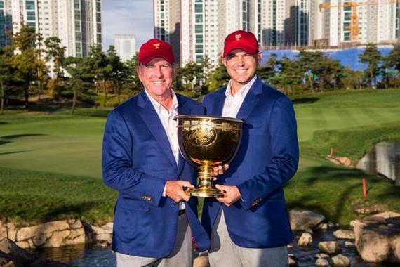 几分钟前,通过父亲外卡进入美国队的比尔-哈斯(Bill Haas)刚刚击败韩国本土球员裴相文,帮助美国队以15.5:14.5战胜了国际队。